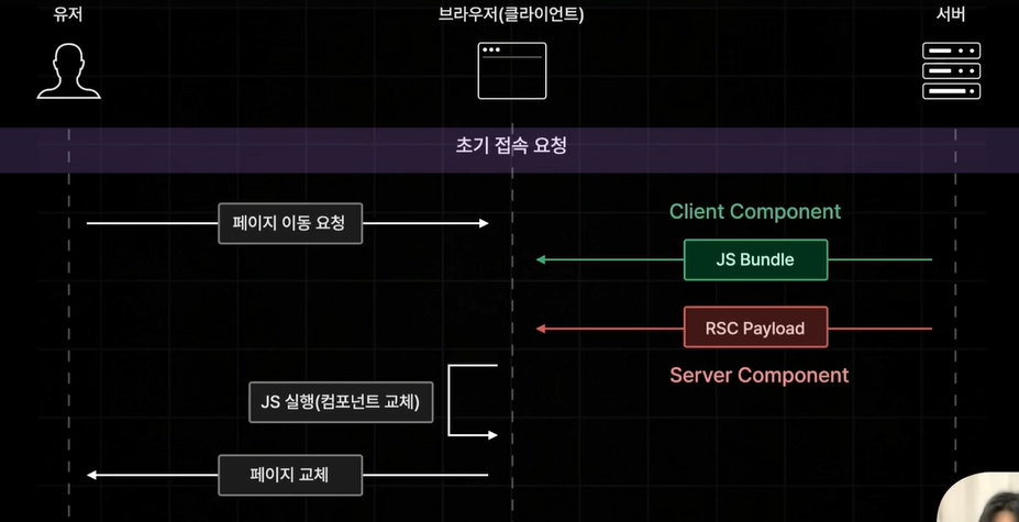기존에 전달되는 js번들에는 이제 클라이언트 컴포넌트의 데이터만 포함되기 때문에 서버 컴포넌트의 실행 결과물인 RSC Payload도 클라이언트에게 함께 전달되게 된다. 클라이언트는 이 RSC Payload와 js번들을 적절히 합쳐 페이지 교체를 실행하게 된다.