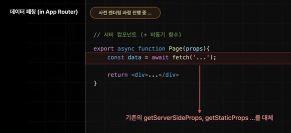 기존 페이지 라우터에서는 모든 컴포넌트가 클라이언트 컴포넌트로 동작하기 때문에 페이지 컴포넌트 내에서 데이터 패칭을 하게 되면 매우 비효율적이다. 따라서 getServerSideProps나 getStaticProps와 같은 메소드를 통해 SSR 또는 SSG 방식으로 데이터 패칭이 이루어지도록 하였다. 하지만 앱 라우터에서는 서버 컴포넌트의 등장으로 더 편리한 방식으로 데이터 패칭을 수행할 수 있게 되었다.