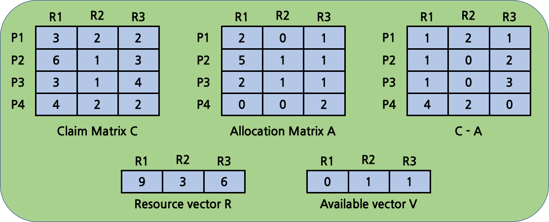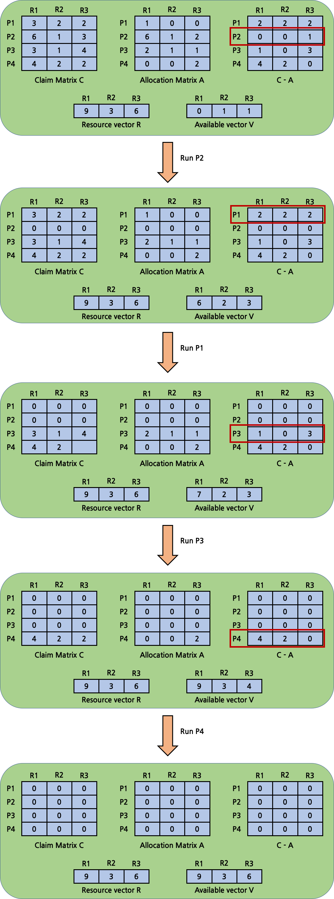 C - A는 추가적으로 할당해야 할 자원들의 행렬이다. V를 C - A의 한 프로세스에게 할당할 때 수행이 끝나는 프로세스를 찾아 할당하면 해당 프로세스의 수행을 종료시킬 수 있다. 이후 A에서 해당 프로세스의 값들을 반환하여 V에 더하고 해당 프로세스의 값들은 C와 C - A에서 모두 0이 된다.