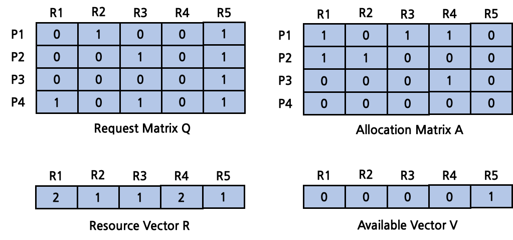 현재 V를 할당하여 수행이 완료될 수 있는 프로세스를 Q에서 찾아서 있다면 해당 프로세스가 종료된 이후 반납할 자원을 V에 추가한다. 이 과정을 반복하여 알고리즘이 종료되었을 때 모든 프로세스가 완료되면 데드락이 발생하지 않은 것이고 그렇지 않다면 데드락 상태가 존재하는 것이다. 이 알고리즘의 단점으로는 현재 데드락의 존재 여부만 파악할 뿐, 이후에 데드락이 생길지 여부는 파악하지 못한다는 점이다.