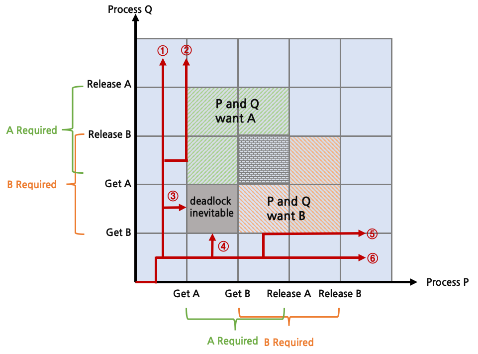 P와 Q라는 두 개의 프로세스가 A와 B라는 자원을 경쟁적으로 사용하며 수행하는 과정이다.