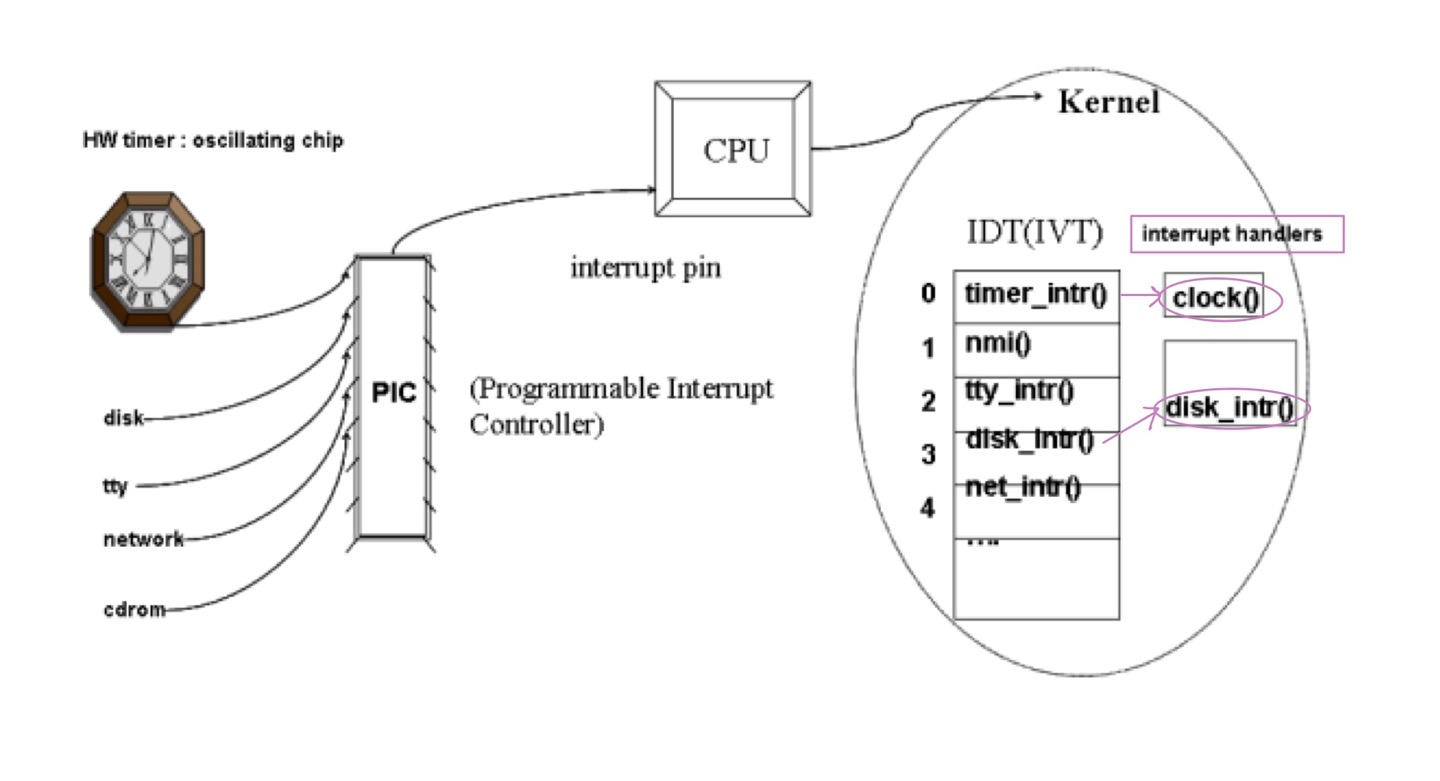 PIC(Programmable Interrupt Controller)가 여러 HW로부터 interrupt 정보를 수집하고 이를 cpu에 전달한다. cpu는 커널의 IDT(Interrupt Descriptor Table)에서 해당 인터럽트의 entry 포인터 값을 찾는다. 이때 유저모드에서 커널모드로 전환되게 되며 찾은 포인터 값은 interrupt handler 내부의 특정 함수를 가리키게 되는데 이를 이용해 인터럽트 처리가 수행된다.