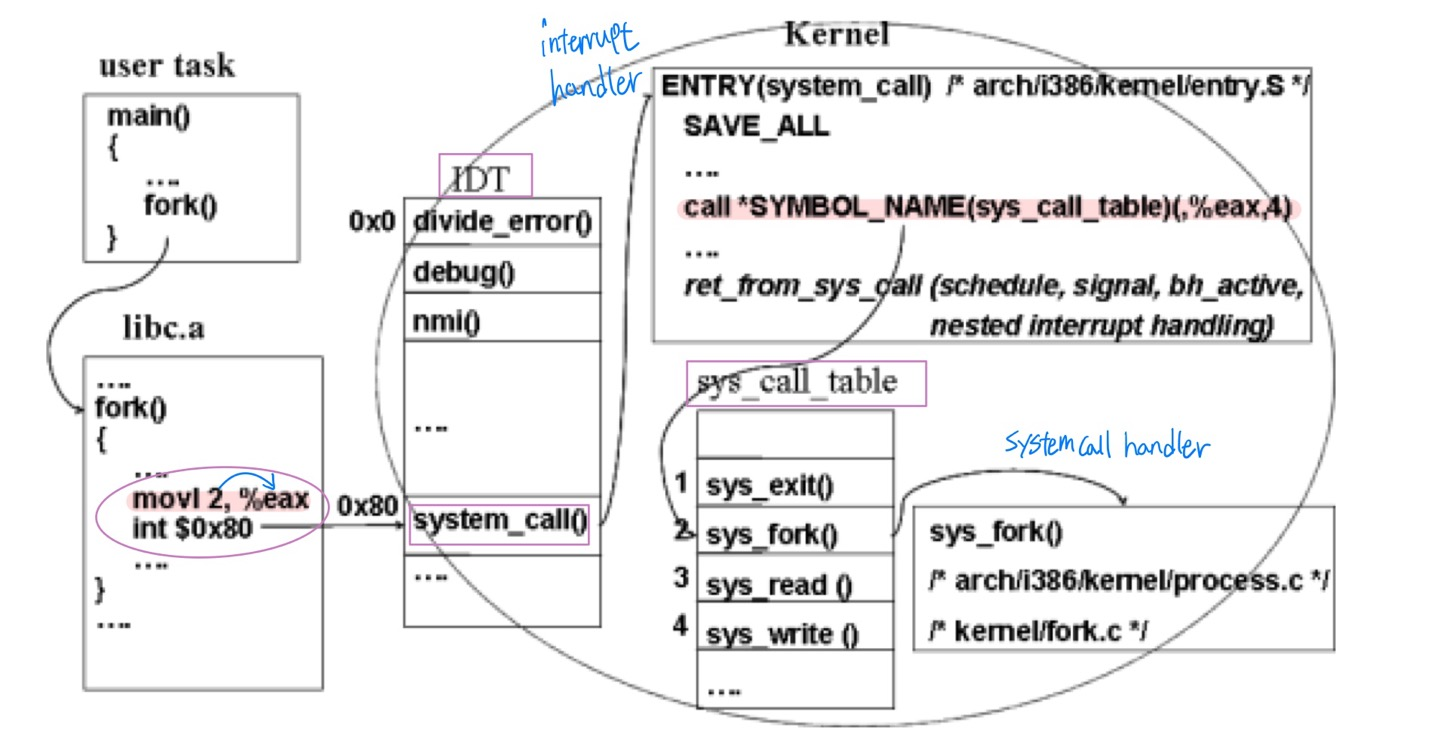 fork()를 호출하는 예시를 통해 시스템 콜 처리 과정을 알아보자. 시스템 콜도 결국 인터럽트이기 때문에 위의 인터럽트 처리과정과 유사하다. fork() 함수는 assembly 코드에서 movl과 int 명령어로 변환된다. movl 2, %eax는 eax 레지스터에 2를 저장하라는 뜻이고 int $0x80은 커널의 IDT에서 0x80 번지로 찾아가라는 뜻이다. IDT의 0x80 번지에 있는 시스템 콜의 entry 포인터 값을 따라간 interrupt handler는 시스템 콜들에 대한 주소를 저장하는 sys_call_table을 갖고 있는데, 해당 table에서 sys_fork()에 대한 주소를 찾은 뒤 system call handler에 의해 sys_fork() 명령어가 실행된다.