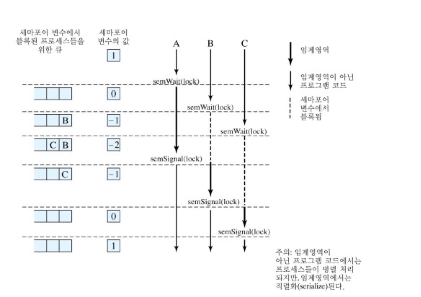 - 임계 영역에 있던 프로세스가 semSignal을 호출하며 빠져나오면, s 값이 1 증가하고 블록되어 있던 프로세스들 중 하나가 대기 큐에서 나와 준비 큐로 이동한다.