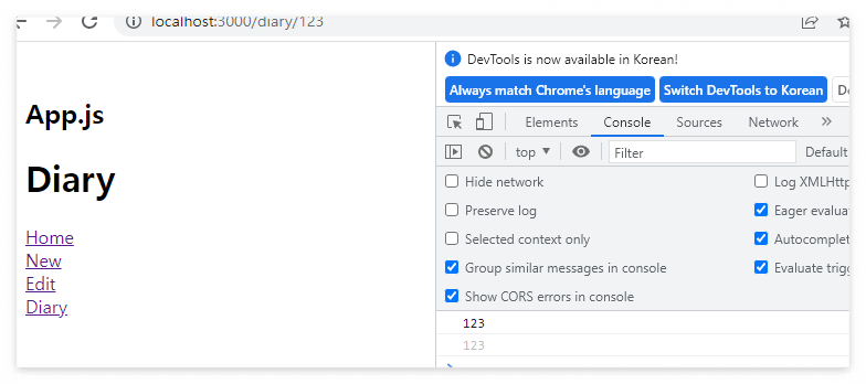 위와 같이 url 경로에 변수를 사용하게 되는 경우가 있다. 예를 들어 첫 번째 일기의 주소는 /diary/1, 두 번째 일기의 주소는 /diary/2와 같이 표현할 수 있다. 이 때 useParams라는 React Hook을 사용한다.