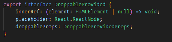 Droppable은 유저가 어떤 것을 드롭할 수 있는 영역을 의미하며, droppableId라는 prop과 함수 형식의 자식 요소를 필수로 넣어줘야한다. Droppable의 자식 요소에 전달되는 magic이라고 불리는 prop은 DroppableProvided이며 다음과 같은 prop들이 정의되어있다.