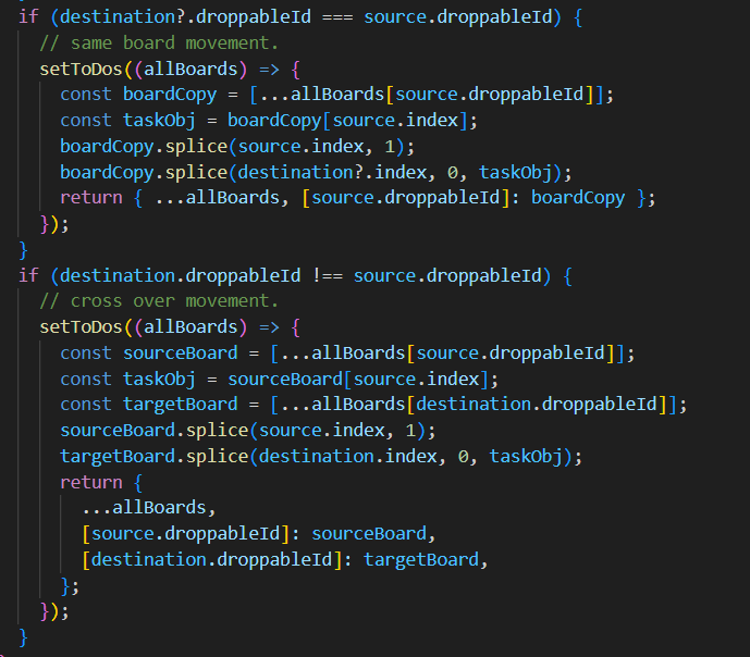 위는 onDragEnd의 타입으로 함수가 어떻게 생겼는지 알 수 있다. DropResult도 열어서 살펴보면 destination, source 등의 prop들이 있는 것을 알 수 있다. 해당 prop들을 이용해서 재정렬 함수를 만들 수 있다.